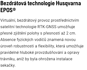 Robotická sekačka Husqvarna Automower® 520 EPOS™ je navržená pro komerční vozový park a jedná se o příbuzný model dobře zavedené sekačky Automower® 550 EPOS. Obsahuje satelitní technologií EPOS™ společnosti Husqvarna s virtuálními hranicemi namísto fyzických vodičů, což vám umožňuje definovat několik pracovních oblastí s různými nastaveními a nastavit dočasně zakázané zóny. Díky systematickému vzoru sečení zvládne sekačka Automower® 520 EPOS™ zelené plochy až do 5000 m². Sekačka se také snadno pohybuje v úzkých průchodech a zvládá svahy až do 45 % (24°) s perfektními výsledky sečení – i za deště. Tato technologie vyžaduje použití referenční stanice EPOS™ RS5.