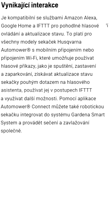 Sekačka detekuje a vyhýbá se objektům, což zajišťuje přesné sečení a snižuje riziko nárazu a neplánovaných zastavení. Pomocí aplikace Automower® Connect můžete svou sekačku sledovat odkudkoli na světě a integrovat ji do vaší chytré domácnosti. Odesílejte příkazy, zobrazujte a změňte nastavení sekačky a přijímejte upozornění pro úplnou kontrolu nad trávníkem.